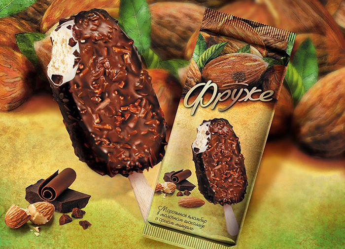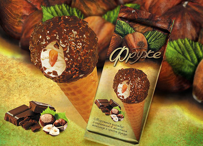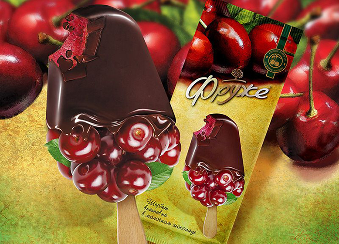 Дизайн упаковки сливочного мороженого и щербетов Фруже. Фотосессии мороженого, иллюстрации.